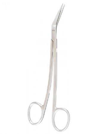 Gum Scissors Curved shank, angled on side 25 degrees, one serrated blade